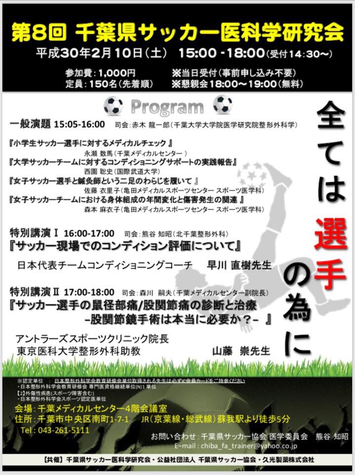 活動報告 2018/02/06 講演情報 2018年2月10日(土)、第8回 千葉県サッカー医科学研究会にて院長の山藤医師が講演を行ってまいります。サッカー競技の治療に携わるスタッフの、医療の質の向上に向けてお手伝いができればと思っております。