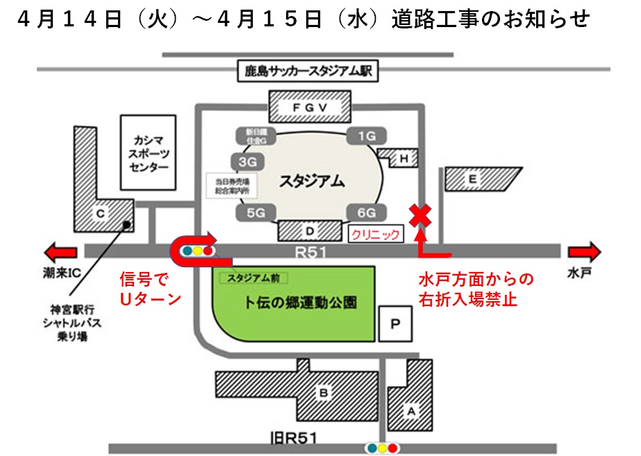 診療案内 2020/04/12 4月14日(火)~15日(水)水戸方面からの駐車場入場について ※工事日程変更しました いつも当院をご利用いただき、有難うございます。 4月14日(火)~15日(水)、道路工事の関係上、水戸方面からの当院駐車場への入場ができません。先のスタジアム入口の信号でUターンをお願い致します。